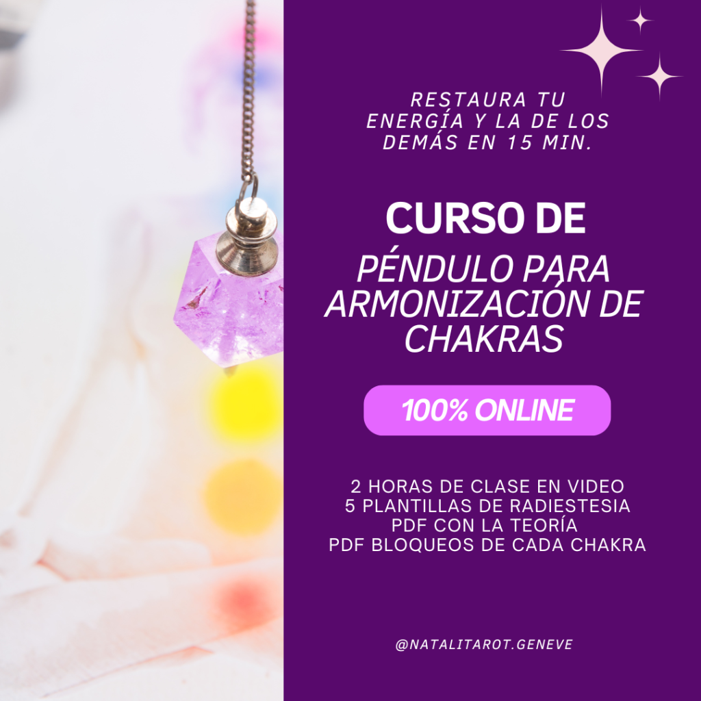 Curso online de péndulo para armonización de chakras Descubre el poder de tu energía a través del uso del péndulo ¿Te gustaría aprender a equilibrar tus chakras y poder tomar decisiones con más claridad? Este curso es una puerta de entrada a tu autoconocimiento y bienestar, usando una herramienta simple pero poderosa: el péndulo. Sí, quiero aprender ¿Sientes que algo en tu vida está bloqueado y no sabes por dónde empezar? A veces, por más que lo intentamos, hay decisiones que no fluyen, relaciones que se estancan o emociones que se repiten como un ciclo sin fin. Nos sentimos cansadas, desorientadas o emocionalmente desbordadas, sin entender del todo por qué. Y la verdad es que todo en nosotras es energía, y esa energía necesita estar en armonía para que nuestra vida fluya como deseamos. Pero si no sabemos cómo leerla, cómo equilibrarla o cómo protegernos, terminamos arrastradas por lo externo, por el caos, por lo que no comprendemos. ¿Te imaginas poder identificar y liberar bloqueos energéticos desde casa? La mayoría de las mujeres nunca ha sido enseñada a gestionar su energía. Por eso viven desconectadas de su poder personal. Se sienten perdidas, estancadas, e incluso dependientes emocionalmente… cuando en realidad tienen todo lo necesario para sanar y avanzar. Usar el péndulo es una forma sencilla y profunda de reconectar con tu intuición y transformar tu campo energético. Es como tener una brújula interna que te guía, te aclara y te armoniza. Por eso creé el Curso Básico de Péndulo. Un espacio diseñado para mujeres como tú, que están listas para despertar, para comprender su energía y para tomar decisiones alineadas con su bienestar. Aprenderás desde cero cómo usar el péndulo para equilibrar tus chakras, limpiar tu campo energético, armonizar espacios y mucho más. No necesitas experiencia previa. Solo tu intención de crecer y de volver a ti. 💫 Tu energía habla. Aprende a escucharla. A leerla. A transformarla. Inscríbete hoy y comienza a vivir desde tu verdadero poder.Tu intuición te está llamando. Sí, quiero aprender ✨¿Este curso es para ti? 💖 SÍ es para ti si… Eres mujer y deseas empoderarte a través del conocimiento energético Buscas una herramienta práctica para mejorar tu bienestar físico, emocional y espiritual Sientes el llamado de acompañar a otros en procesos de sanación Eres terapeuta y quieres complementar tus sesiones con una herramienta vibracional ❌ NO es para ti si… 🚫 Estás buscando una solución mágica sin compromiso personal 🚫 No crees en la energía o rechazas todo lo espiritual 🚫 No estás dispuesta a dedicar al menos 2 horas por semana a tu bienestar 🚫 Preferes seguir dependiendo de otros para sentirte bien, en lugar de aprender a sostenerte desde tu energía 🌿 Este curso es una experiencia transformadora para mujeres que quieren dejar de apagarse por dentro y empezar a brillar con intención y poder.Si eso resuena contigo… estás en el lugar correcto. Sí, Quiero aprender Soy Natalia Durán 🌟 Coach certificada en energía vital. Mi camino en la energía empezó en uno de los momentos más difíciles de mi vida: saliendo de una relación tóxica, siendo madre joven y soltera, y con la urgencia de salir adelante con mis hijos.En lugar de victimizarme, elegí mirar hacia adentro y buscar respuestas en el mundo espiritual. Descubrí que muchas de mis experiencias se repetían porque mi vibración estaba muy baja, y que no podía cambiar mi vida sin antes cambiar mi energía. Así fue como el tarot llegó a mí: como una brújula para guiar mis decisiones. Abrí mi canal de YouTube, donde conecté con una comunidad hermosa y ayudé a miles de personas a través de mis lecturas. Pero cuanto más escuchaba a mis consultantes, más claro entendía que no bastaba con desvelar el futuro: había una necesidad urgente de sanar. Por eso me certifiqué como Maestra de Reiki, y seguí formándome en distintas técnicas energéticas, emocionales y espirituales, hasta crear mi propio método de coaching: un enfoque integral para ayudar a mujeres a entender cómo funciona la energía, elevar su vibración y recuperar su poder. Desde entonces, he impartido cursos de tarot, talleres de amor propio, limpieza energética y manifestación.Y en 2022, la vida me desafió otra vez: emigré a Suiza con mis hijos, empezando desde cero en un nuevo país. Fue difícil, pero también hermoso: allí conocí al amor de mi vida, me casé y decidí relanzar mi emprendimiento con más fuerza y sabiduría que nunca. Hoy estoy aquí para compartir todo lo que aprendí contigo, y acompañarte a transformar tu energía… y tu vida. ✨ No importa dónde estés hoy. Si estás lista para reconectar con tu luz, yo estoy lista para acompañarte. Quiero aprender 🌺 Beneficios que obtendrás Desde hoy mismo vas a acceder a una clase pregrabada en video, contenido práctico y acompañamiento constante para integrar todo lo que necesitás para sentirte fuerte, protegida y alineada con tu verdadero poder. Conexión profunda contigo misma y con tu intuición Sabras qué és la energía, qué és la radiestésia, cómo funciona un péndulo y cómo conectar con él. Además de conocer cómo funciona tu cuerpo energético. Herramientas para armonizar tu energía y la de los demás Te enseñaré a utilizar el péndulo, los cuarzos y el poder de las afirmaciones para hacer un diagnóstico de la energía y reestaurar el equilibrio de los chakras. Podrás aplicarlo a otras personas y animales. Mayor claridad mental y emocional Tu mente racional va a ser capaz de comprender éste método de una manera clara y sencilla. Además, después de aplicarlo, te vas a sentir más liviana, alineada y limpia de todo lo que no es tuyo. Un recurso práctico que podrás usar a diario en tu crecimiento personal o acompañamientos energéticos Éste método te servirá para hacerlo tanto presencial como a distáncia. Además, incluye: ✅ Cu